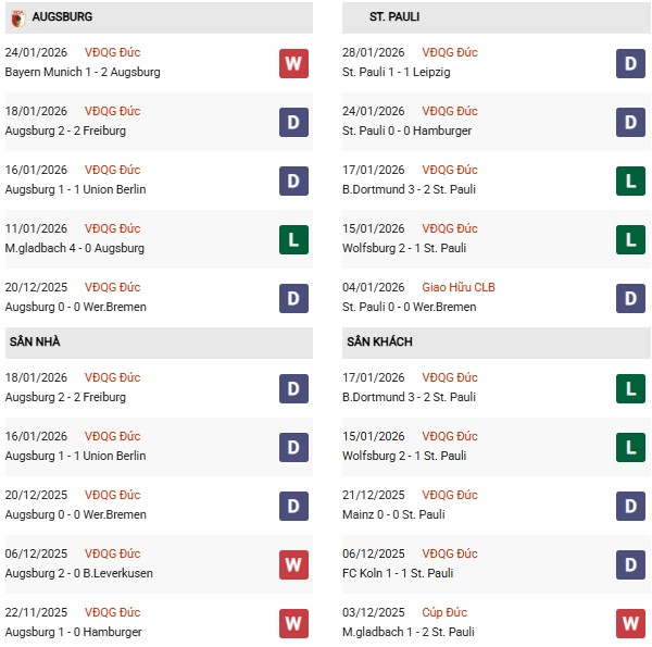 - Trên sân nhà, Augsburg thắng cả 4 trận trước St. Pauli.