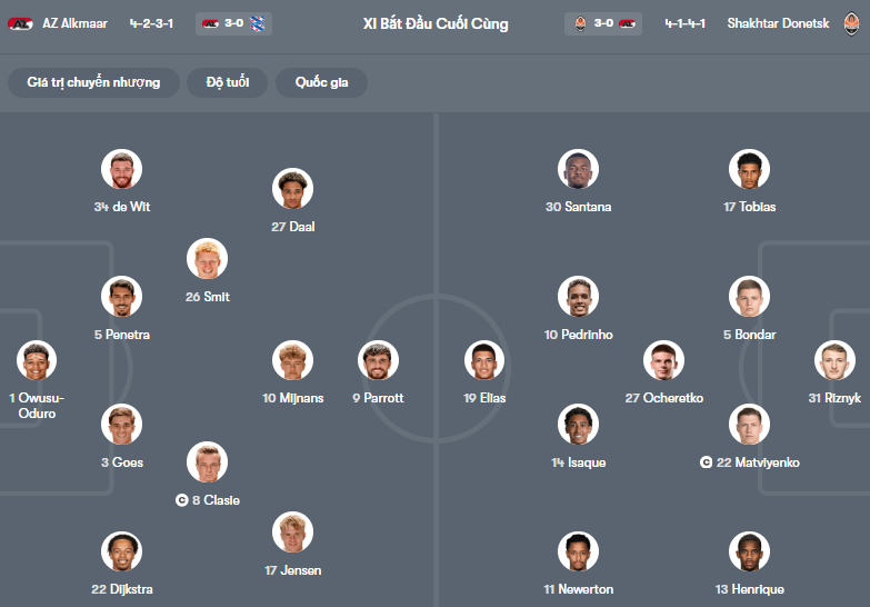 Đội hình dự kiến AZ Alkmaar vs Shakhtar Donetsk: