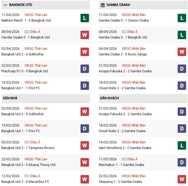 Bangkok United đang có phong độ khá tích cực trước trận lượt về này. Họ thắng 2, hòa 2 và chỉ thua 1 trong 5 trận gần nhất trên mọi đấu trường. Đặc biệt, chiến thắng 1-0 ngay trên sân của Gamba Osaka ở lượt đi giúp đại diện Thái Lan nắm lợi thế lớn. Dù lép vế hoàn toàn về thế trận (chỉ kiểm soát bóng 28% và tung ra 8 cú sút so với 21 của đối thủ), Bangkok United vẫn biết cách tận dụng cơ hội với bàn thắng trên chấm phạt đền của Muhsen Al Ghassani.