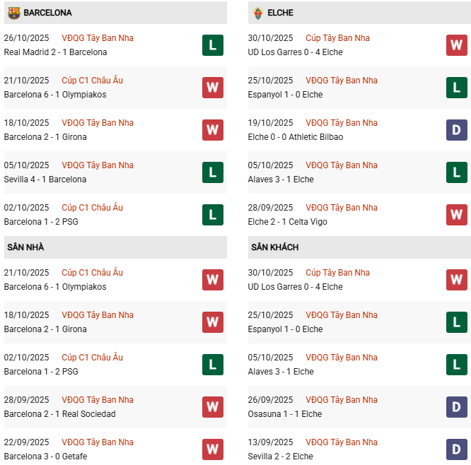 - Barcelona toàn thắng cả 10 trận đối đầu Elche gần đây.
