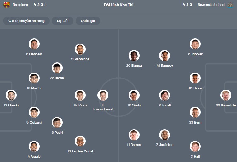 Đội hình dự kiến Barcelona vs Newcastle: