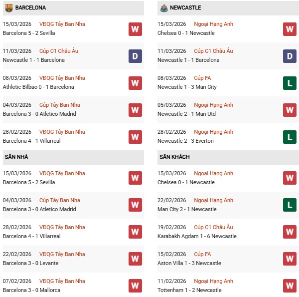 Thống kê phong độ Barcelona vs Newcastle: