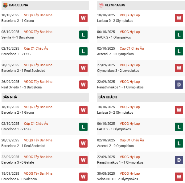 Từ 3 bàn thắng trở lên: 8 trận liên tiếp gần đây của Barca cùng 3/5 trận vừa qua của Olympiakos đều có từ 3 bàn thắng trở lên. Lịch sử đối đầu cũng ghi nhận màn so tài gần nhất giữa hai đội trên sân nhà của Barca có tới 4 pha làm bàn.