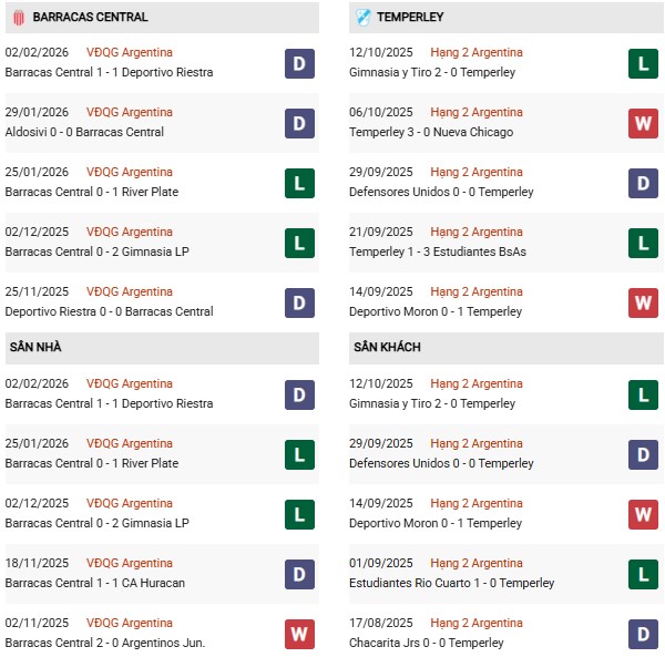 - Trên sân nhà, Barracas Central thắng 2, thua 2 trước Temperley.