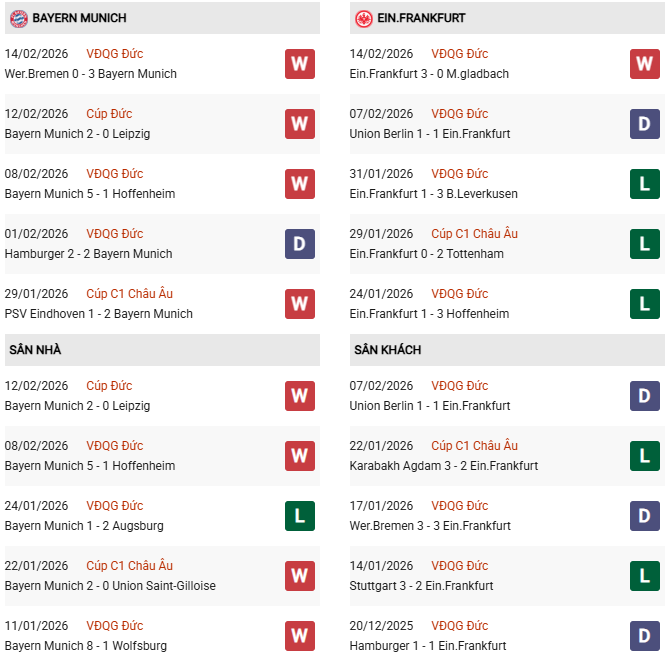 - Trên sân nhà, Bayern Munich thắng 7, thua 2 trước Frankfurt.