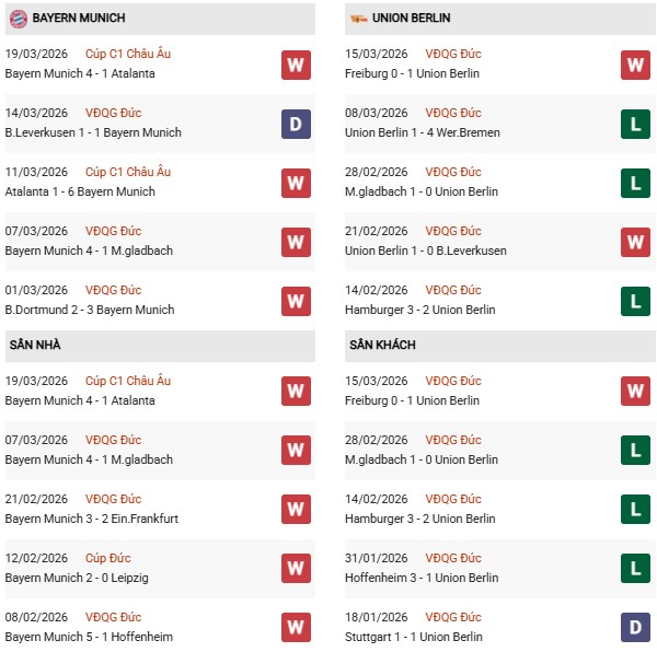 Thống kê phong độ Bayern Munich vs Union Berlin: