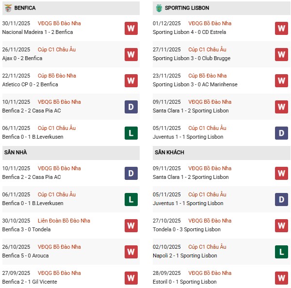 Thống kê phong độ Benfica vs Sporting Lisbon: