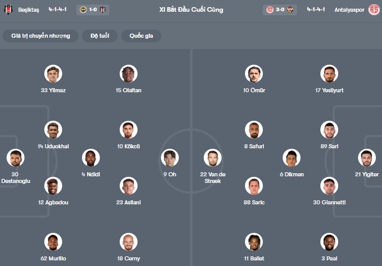 Đội hình dự kiến Besiktas vs Antalyaspor: