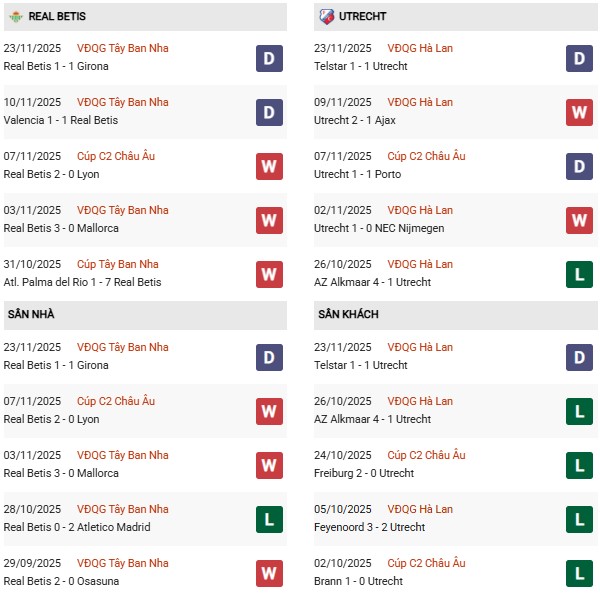 Thống kê phong độ Betis vs Utrecht: