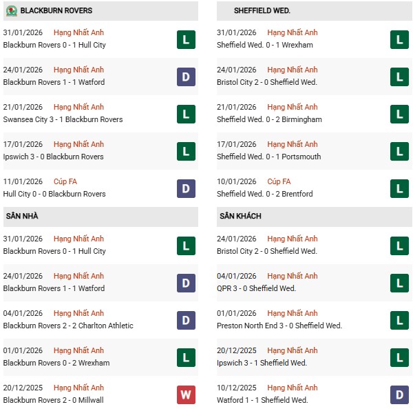 Thống kê phong độ Blackburn vs Sheffield Wed: