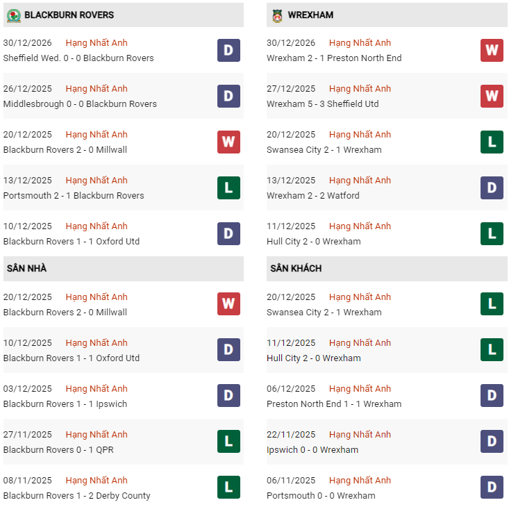 - 3 lần gần nhất gặp nhau, Blackburn thắng 1 và hòa 2 trước Wrexham