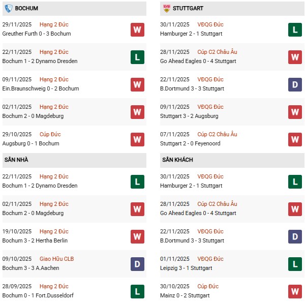 - Bochum thắng 1, hòa 2, thua 7 trong 10 trận gặp Stuttgart gần đây.