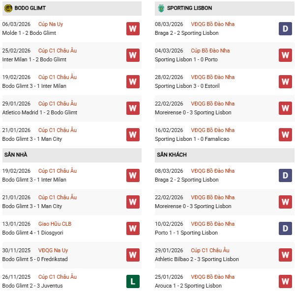 Thống kê phong độ Bodo Glimt vs Sporting Lisbon: