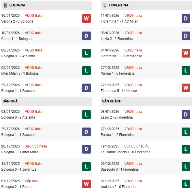 Thống kê phong độ Bologna vs Fiorentina: