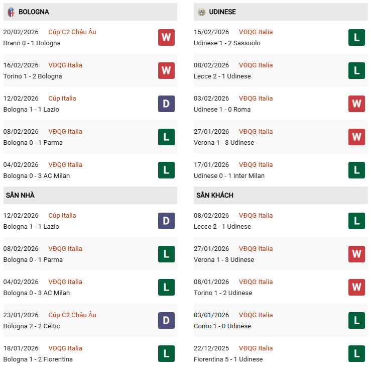 - 10 trận đối đầu vừa qua, Bologna thắng 3 thua 1 và hòa 6 trước Udinese.
