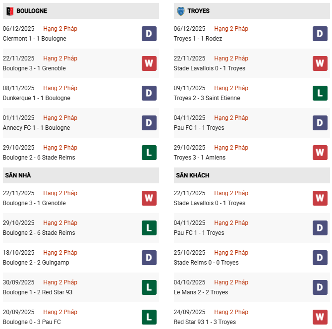 Ngược lại, Boulogne lại cho thấy sự yếu kém nghiêm trọng trong phòng ngự sân nhà, nơi họ để thủng lưới tới 2.12 bàn/trận (chiếm 71% tổng số bàn thua) và xếp hạng áp chót về chỉ số này. Tuy nhiên, Boulogne vẫn ghi được 1.25 bàn/trận trên sân nhà. Dù vậy, dữ liệu đối đầu lại vẽ nên một bức tranh khác, với 4/8 lần gặp gỡ gần nhất chỉ có tối đa 1 bàn thắng, và Troyes có chuỗi 4 trận sân khách liên tiếp không thể ghi bàn vào lưới Boulogne.