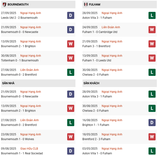 Thống kê phong độ Bournemouth vs Fulham: