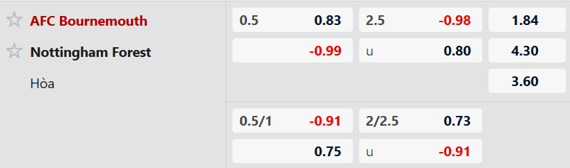 Thông tin tỷ lệ kèo Bournemouth vs Nottingham: