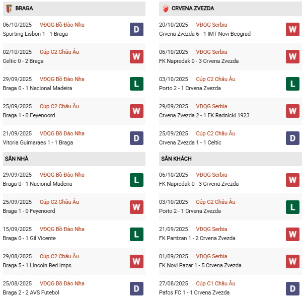 Thống kê phong độ Braga vs Crvena Zvezda: