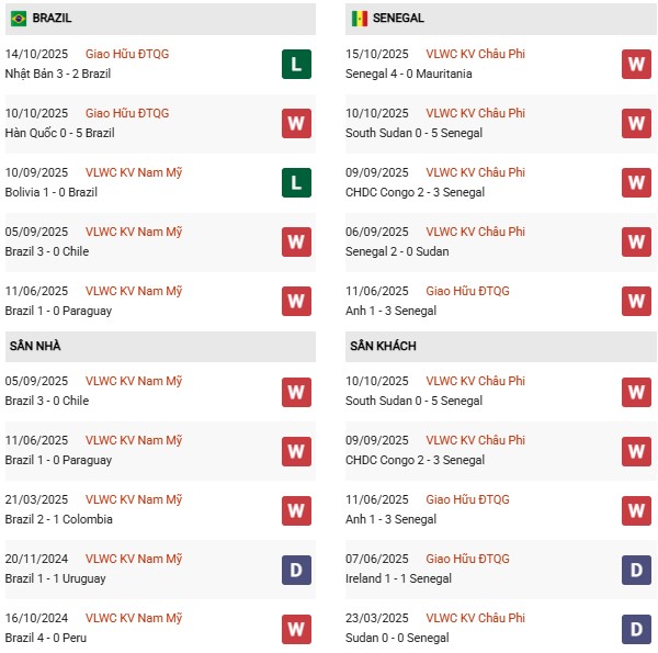 - Brazil hòa 1, thua 1 trong 2 trận gặp Senegal gần đây.