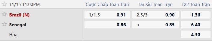 Thông tin tỷ lệ kèo bóng đá Brazil vs Senegal: