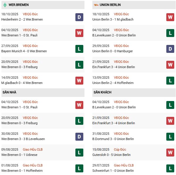 - Trên sân nhà, Bremen thắng 2, thua 3 trước Union Berlin.