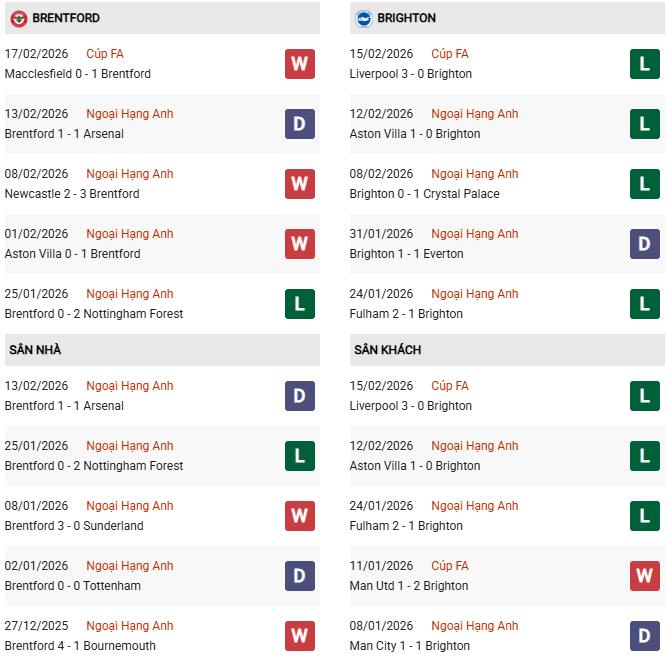 Thống kê phong độ Brentford và Brighton: