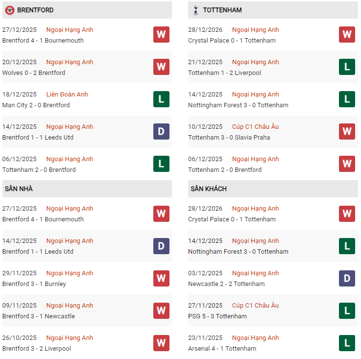 Xét về lịch sử đối đầu, mặc dù Spurs thường chiếm ưu thế trong quá khứ, nhưng ở lần chạm trán gần nhất vào ngày 6/12/2025, Brentford đã gây sốc khi đánh bại Tottenham với tỷ số 2-0. Với việc được chấp +0.25 ngay trên sân nhà Gtech – nơi họ thắng đến 70% số trận từ đầu mùa – lựa chọn Brentford là phương án đầu tư cực kỳ tiềm năng.