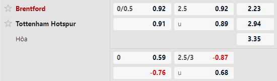 Thông tin tỷ lệ Brentford vs Tottenham Hotspur: