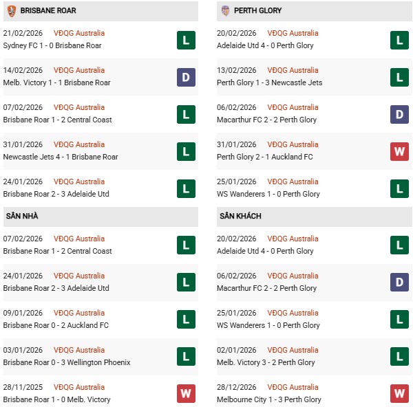 Thống kê phong độ Brisbane Roar vs Perth Glory: