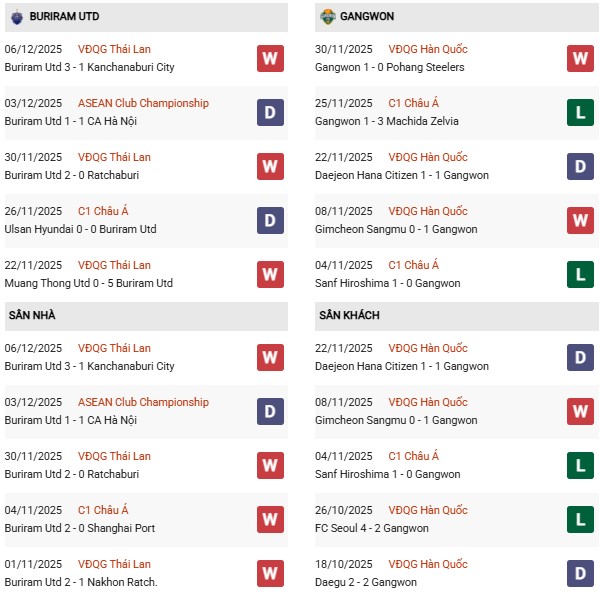 Gangwon đang xếp ngay phía sau Buriram với 6 điểm. Họ không phải đội bóng dễ bị bắt nạt, nhưng phong độ lại thiếu sự ổn định khi chỉ thắng 3 trong 10 trận vừa qua. Khi thi đấu xa nhà, Gangwon càng để lộ nhiều hạn chế, bởi trong 10 trận sân khách gần nhất họ chỉ thắng 2, còn lại chủ yếu là hòa và thua. Hàng thủ chưa thật chắc chắn cùng lối chơi phản công còn thiếu sự sắc bén khiến Gangwon gặp nhiều khó khăn khi đụng độ các đội có nhịp độ lên bóng nhanh như Buriram.