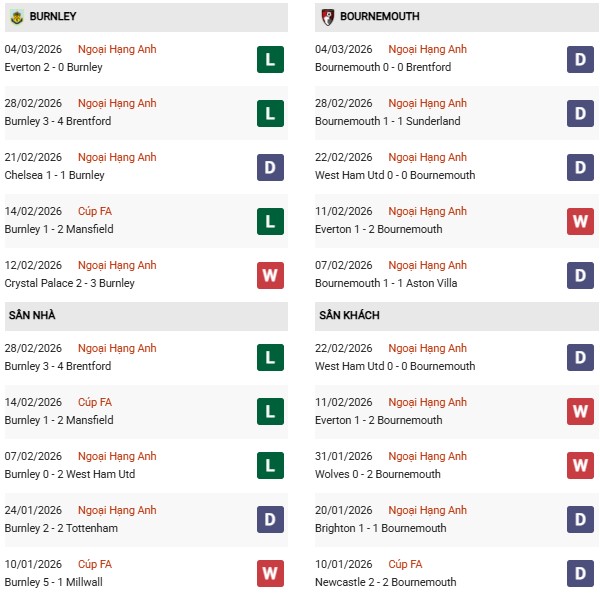 Thống kê phong độ Burnley vs Bournemouth: