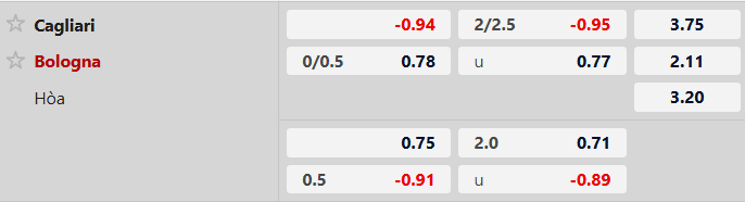 Thông tin tỷ lệ kèo Cagliari vs Bologna: