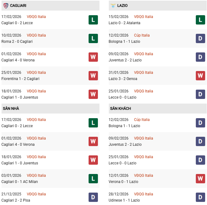 Lazio thường chiếm ưu thế đối đầu nhưng phong độ tổng thể thiếu ổn định, còn Cagliari lại có động lực lớn trên sân nhà.