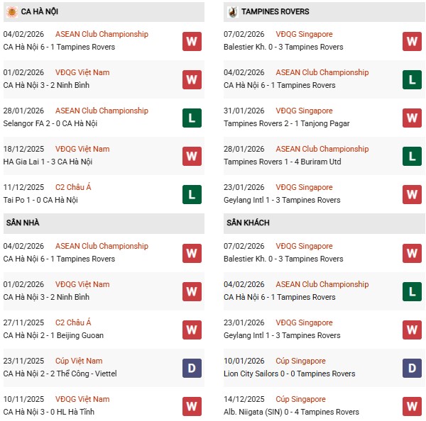 Thống kê phong độ CAHN vs Tampines Rovers: