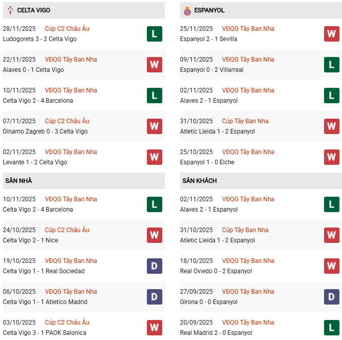 - Trên sân nhà, Celta Vigo thắng 3, thua 1 trước Espanyol.