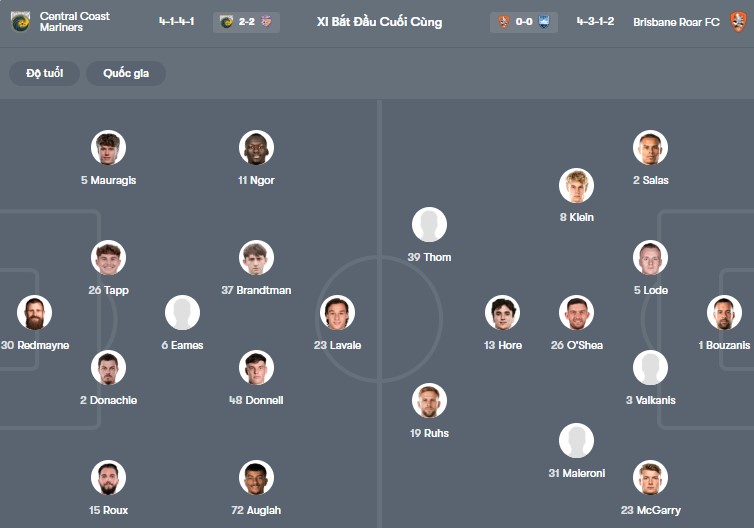 Đội hình dự kiến Central Coast vs Brisbane Roar: