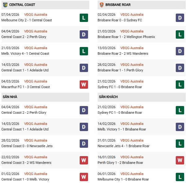 Thống kê phong độ Central Coast vs Brisbane Roar: