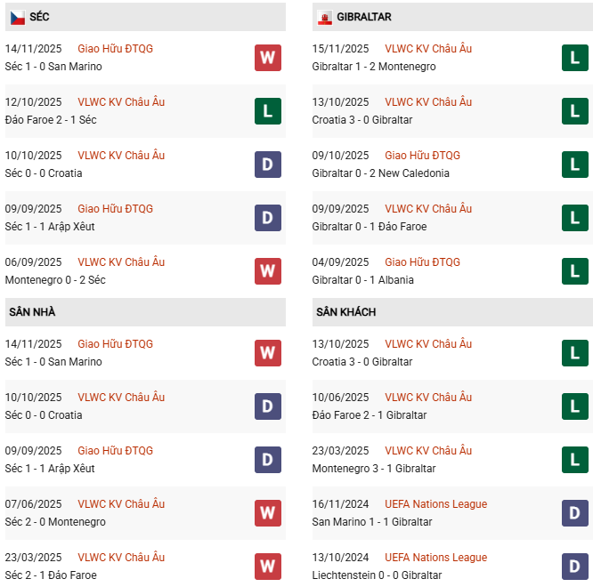 Thành tích đối đầu CH Séc vs Gibraltar: