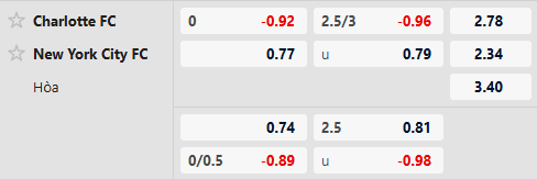 Các cầu thủ Charlotte để thua kèo châu Á 2/4 trận đấu gần đây của mình. Với New York City, đội khách thắng kèo 4/5 trận xa nhà vừa qua. Họ cũng không thua kèo 2 trận sân khách gần nhất xuất hiện tỷ lệ 0:0 như trận này, trong đó có 1 chiến thắng và 1 trận hòa. Đối đầu với một New York City có màn trình diễn bùng nổ trên sân khách, Charlotte nhiều khả năng sẽ ôm hận ở trận đấu này.