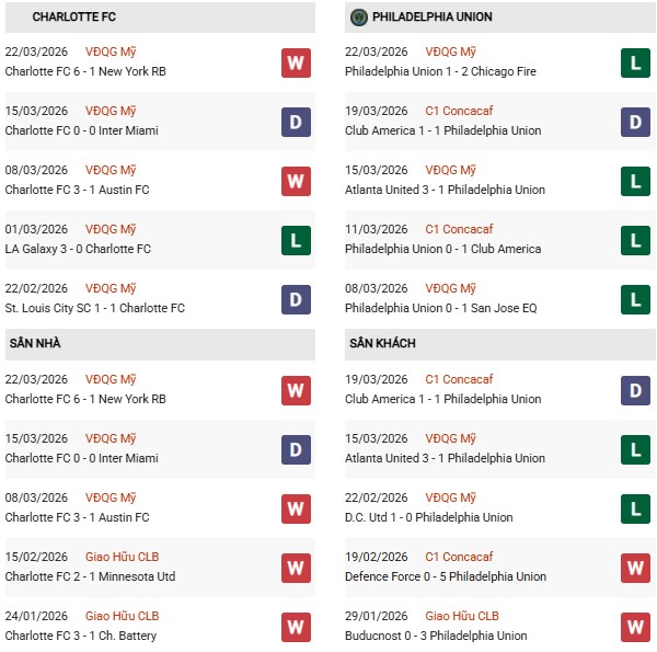 - Trên sân nhà, Charlotte thắng 2, hòa 2 trước Philadelphia Union.