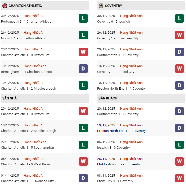 Trở lại với chuyến làm khách tại Charlton lần này, Coventry quyết tâm tìm lại niềm vui chiến thắng. Họ có đối đầu vượt trội với 4 trận bất bại, trong đó có 3 chiến thắng liên tiếp, trước đối thủ này. Hơn nữa, về phong độ chung, thày trò Lampard cũng thi đấu thuyết phục hơn đối phương.