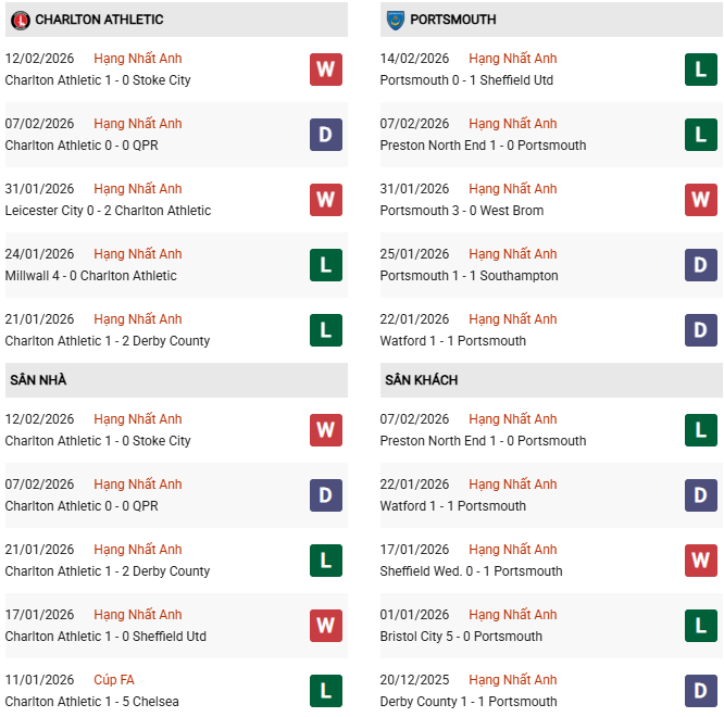 - Trên sân nhà, Charlton thắng 4, thua 4 trước Portsmouth.