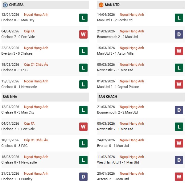 Thống kê phong độ Chelsea vs MU: