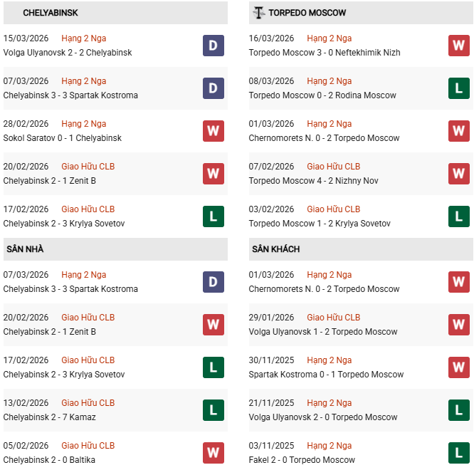 Thống kê phong độ Chelyabinsk vs Torpedo Moscow: