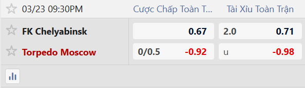 Thông tin tỷ lệ kèo Chelyabinsk vs Torpedo Moscow:
