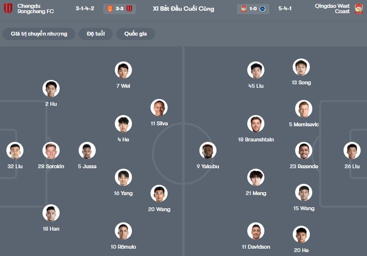 Đội hình dự kiến Chengdu vs Qingdao West Coast:
