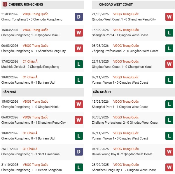 - Chengdu thắng 1, hòa 3 trong 4 trận gặp Qingdao West Coast gần đây.