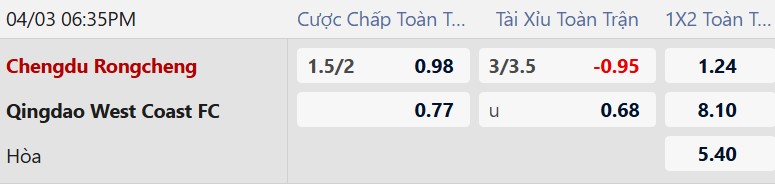 Thông tin tỷ lệ cược Chengdu vs Qingdao West Coast: