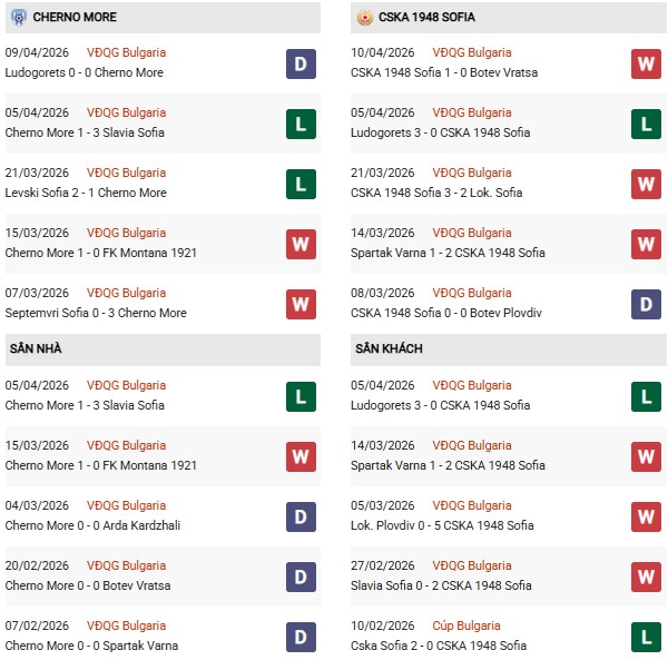 - Trên sân nhà, Cherno More thắng 3, thua 1 trước CSKA 1948 Sofia.